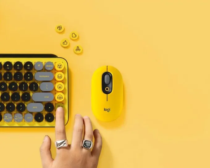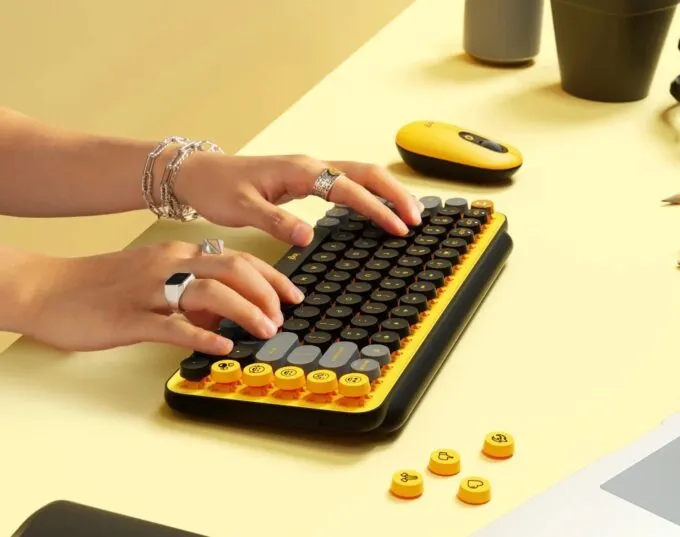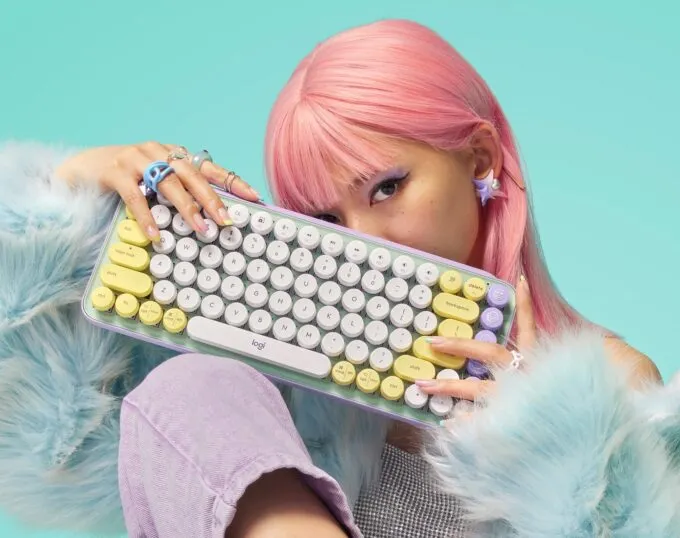 Logitech Pop Keys — компактная клавиатура на механических свитчах Cherry MX Brown с круглыми кейкапами на высокой платформе. Внешне она отдаёт вайбами печатных машинок в стиле ретро. Эта модель доступна в трёх расцветках: малиновой с розовыми клавишами, жёлтой с чёрными и фиолетово-мятной с белыми кейкапами.