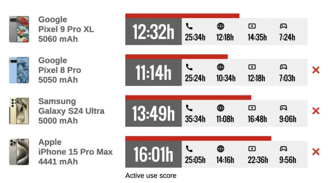 В тестировании GSM Arena девайс, получивший батарею 5060 мАч, повел себя отлично — если сравнивать с другими «пикселями». Общее время работы составило 12 часов 32 минуты — это больше, чем у Pixel 8 Pro, но сильно меньше, чем у конкурентных моделей Apple и Samsung.