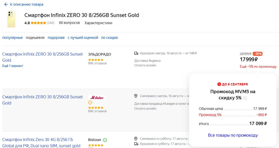 А что по цене? На Маркете Infinix Zero 30 4G доступен всего за 17 100 рублей — нужно всего лишь применить код MVM5 на стадии оформления заказа. Если что, в корзину надо добавить лот от «М.Видео» или «Эльдорадо» — у остальных селлеров смарт заметно дороже. Вообще, акция продлится до 9 сентября, но с покупкой лучше не медлить — запасы могут быстро закончиться.