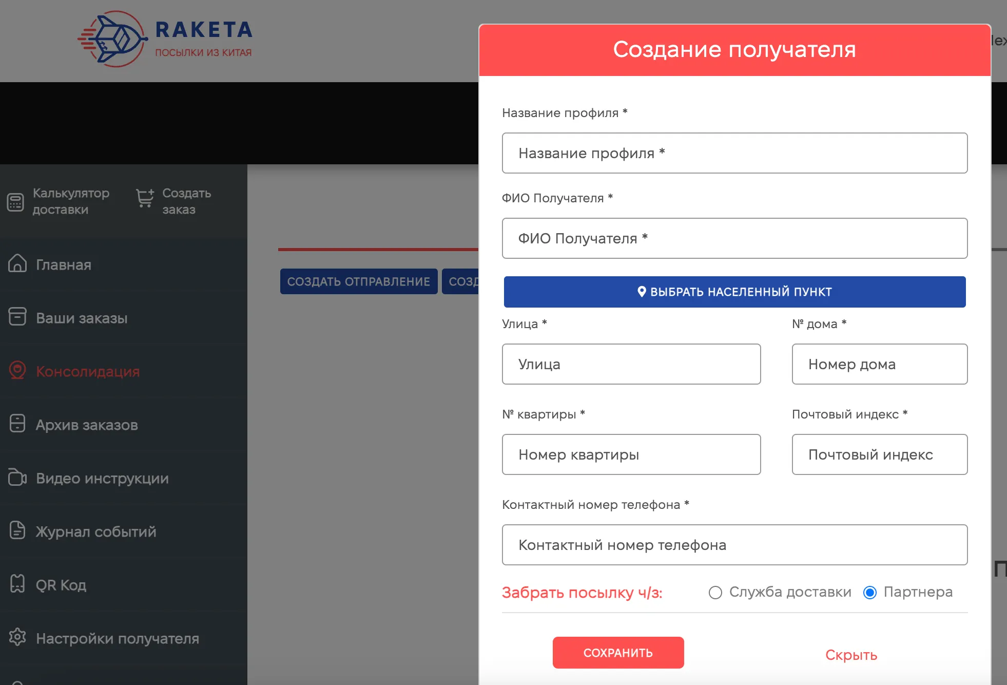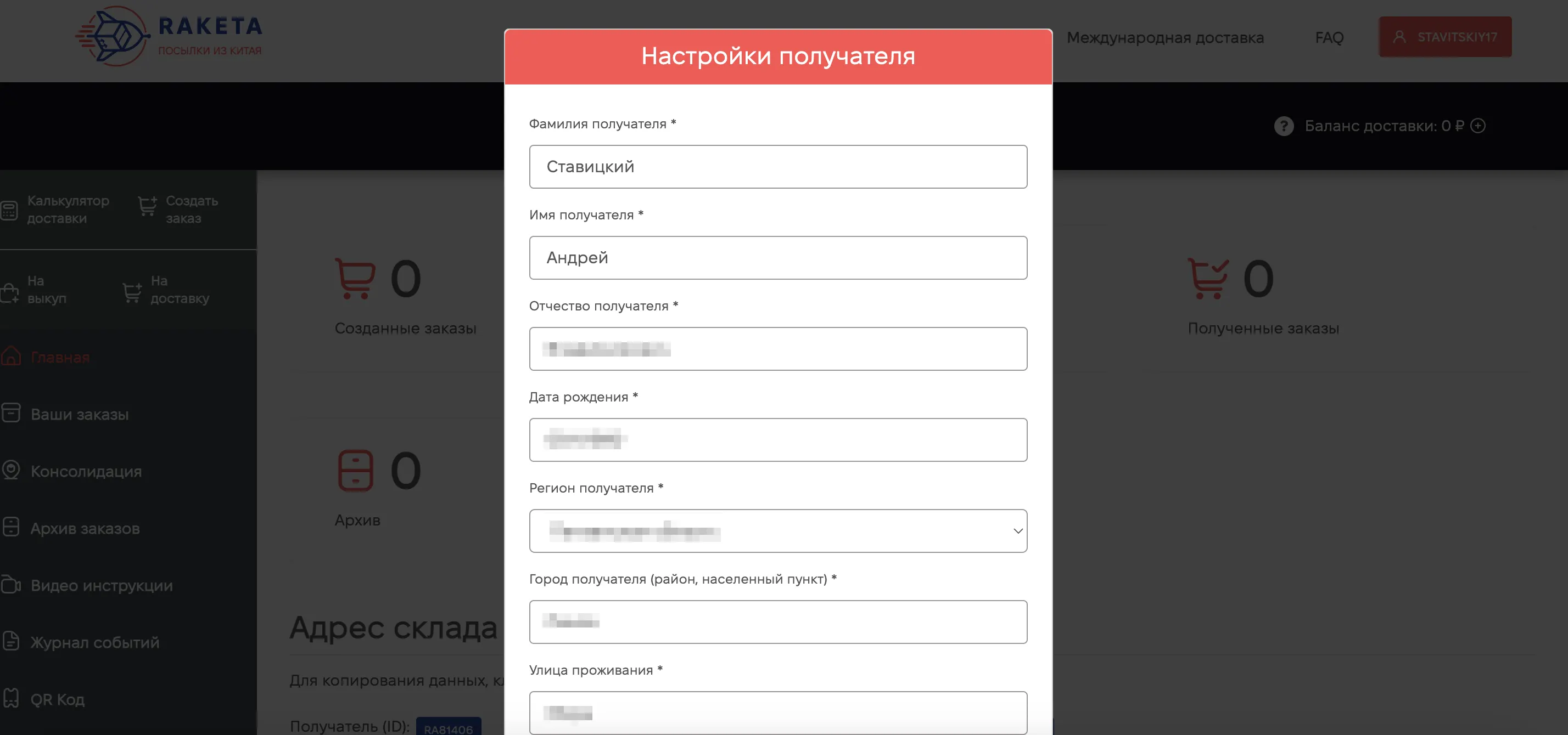 Сначала нам нужно создать личный кабинет на сайте RAKETA. Вводим информацию о себе — обязательно указываем настоящие ФИО, данные паспорта, домашний адрес, телефон. Все это потребуется, чтобы пройти таможенный досмотр при доставке посылок из Китая в Россию.