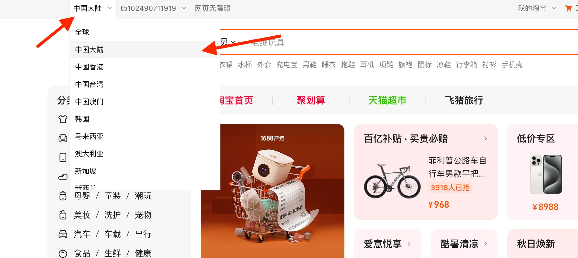 В-третьих, после регистрации включите версию сайта Taobao для материкового Китая — так будет доступно больше товаров и продавцов. Это вторая строчка в выпадающем меню слева.