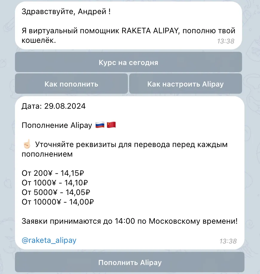К сожалению, закинуть на счет российские рубли напрямую не получится, если у вас нет китайского счета или карты иностранного банка. Пополнить баланс можно через телеграм-бота RAKETA ALIPAY. Тут нет ничего сложного: