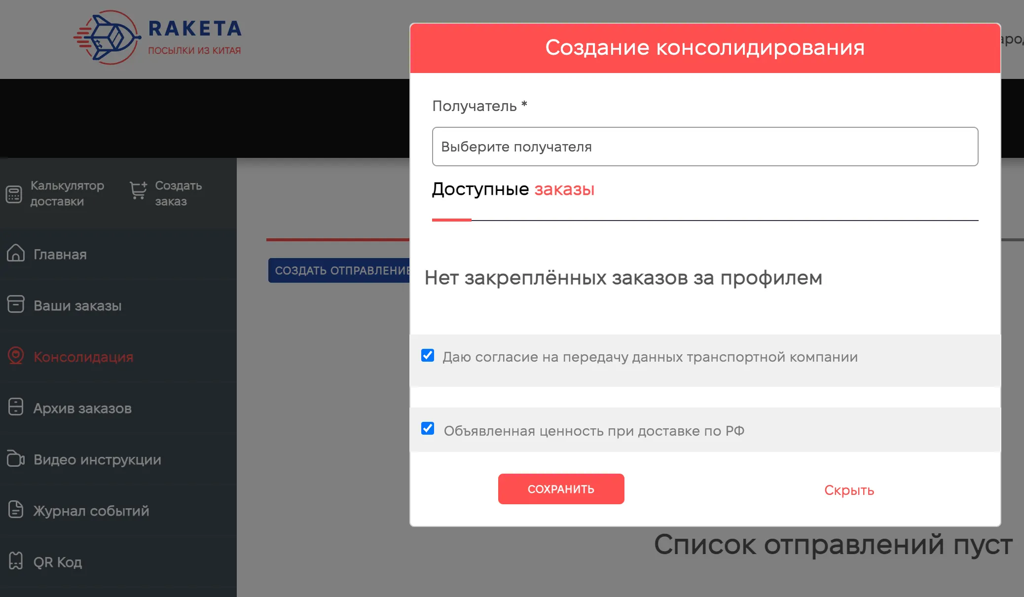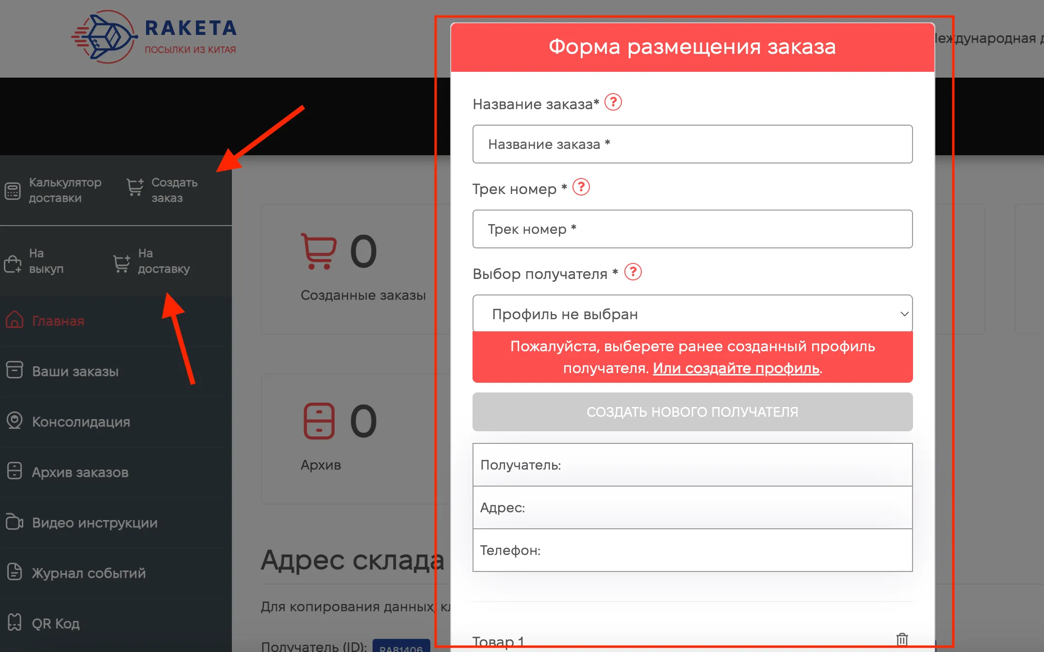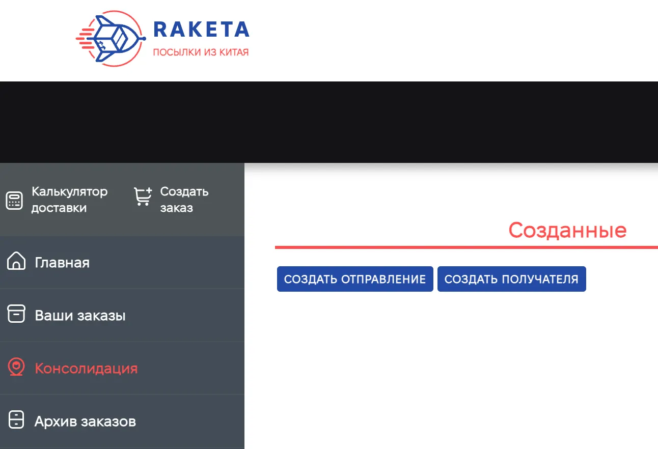 Движение посылки от продавца до склада RAKETA можно отслеживать на сайте или в приложении конкретного сервиса — Taobao, JD или другого. Затем доставленный от продавца товар появится в личном кабинете посредника. Заказ на доставку можно создать сразу после того, как у товара появляется трек номер. Для этого переходим в личный кабинет: