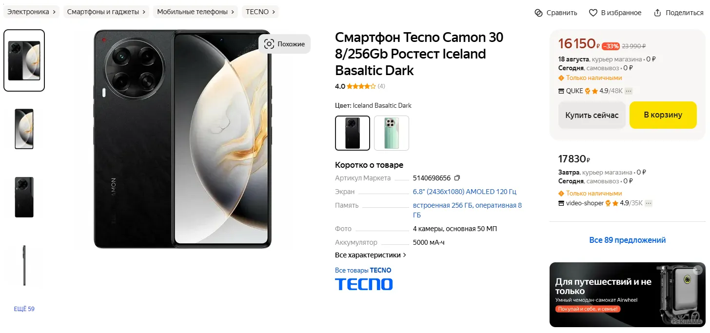 Tecno Camon 30 — один из самых любопытных смартфонов, вышедших в этом году. Это стильный девайс с классными характеристиками, который еще и постоянно дешевеет на Маркете. На старте продаж за «тридцатку» просили аж 24 тысячи, а сейчас — всего 16 150 рублей.