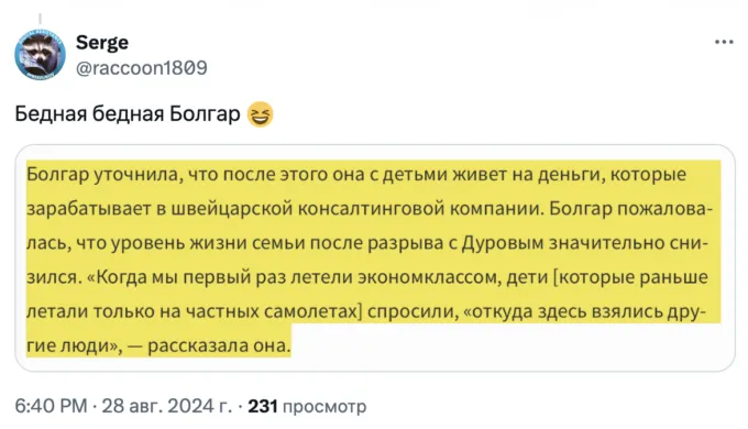 В конце женщина рассказала, что ей с детьми приходится жить на деньги, которая она зарабатывает в швейцарской консалтинговой компании. И посетовала, что уровень жизни сильно упал: «Когда мы первый раз летели эконом-классом, дети [которые раньше летали только на частных самолетах] спросили, „откуда здесь взялись другие люди“». 29 августа Ирина Болгар рассказала, что суд принял ее сторону и лишил Павла Дурова родительских прав.