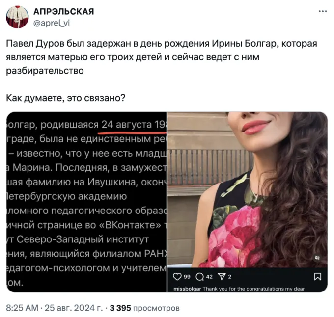Разбирательство во французском деле Павла Дурова продолжается, но на фоне давления местных властей основателя Telegram прессует еще и бывшая подруга. Ирина Болгар, которую называют матерью троих детей предпринимателя, подала на него в суд.