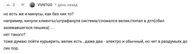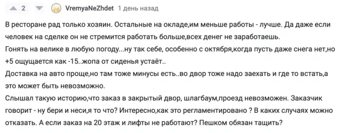 Юзер под ником @Vitalik101 рассказал, что стал курьером пять лет назад. Во время учебы в универе парень решил проводить свободное время с пользой, купил велосипед, взял сумку и устроился в доставку пищи. Автор не упоминает, на какой сервис он работает. Возможно, речь идет о «Яндекс Еде».