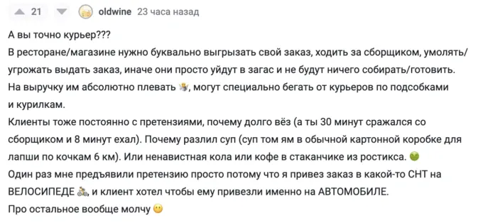 Парня спрашивали, почему он не хочет более выгодно монетизировать свое свободное время – то есть, пойти в такси. «А оно мне надо? Возить пьяных царьков, отмывать блевоту, включать музыку по требованию пассажира, выслушивать негодование, почему я не заехал за ним на третий этаж, и прочее „вези меня мразь“?» — удивился вопросу курьер.