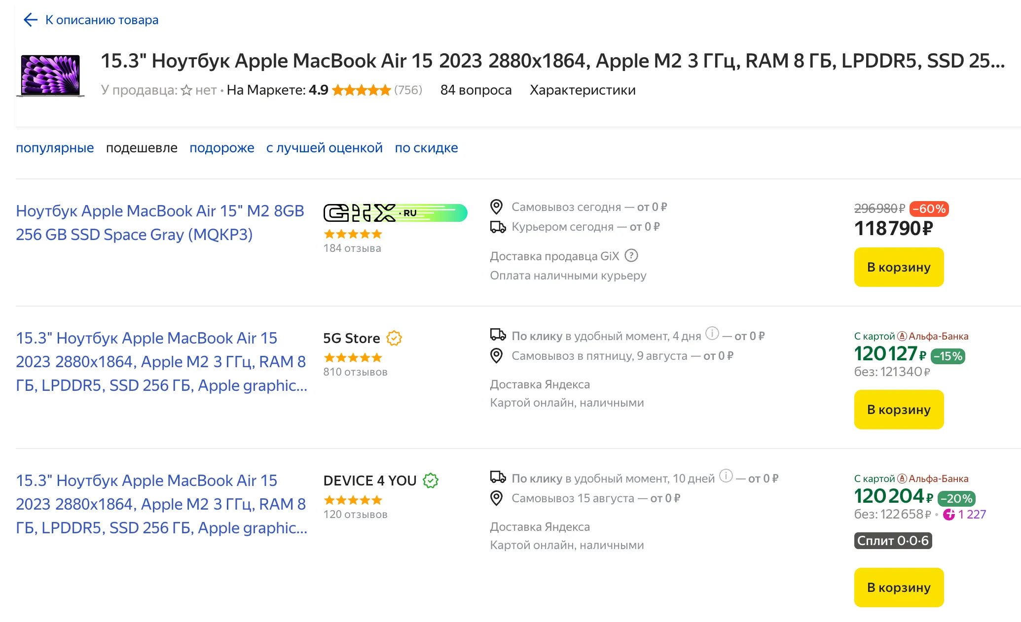 - MacBook Air 15 M2 (8/256 Гбайт) — 118 800 рублей. Прошлый месяц — 131 000 рублей
