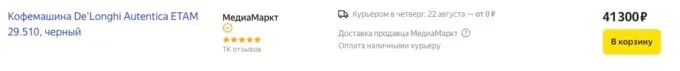 Обычно такие кофемашины стоят под 60 тысяч рублей, но сейчас на Яндекс Маркете флагманскую De’Longhi Autentica можно урвать всего за 41 300 рублей.