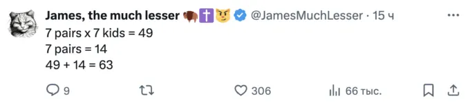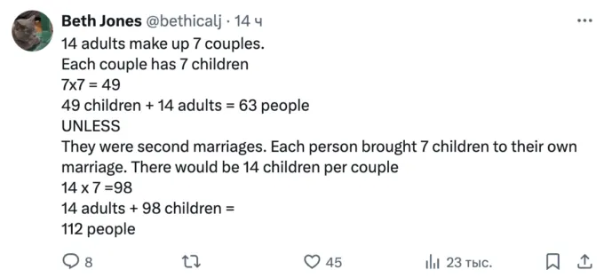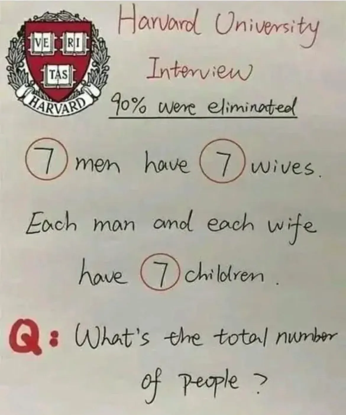 Звучит она так — у 7 мужчин 7 жен. У каждого мужчины и каждой жены по 7 детей. Каково общее количество людей? Ниже можно посмотреть варианты ответов.