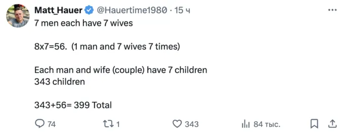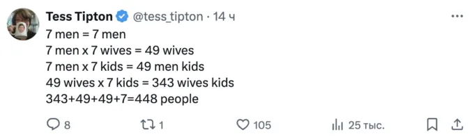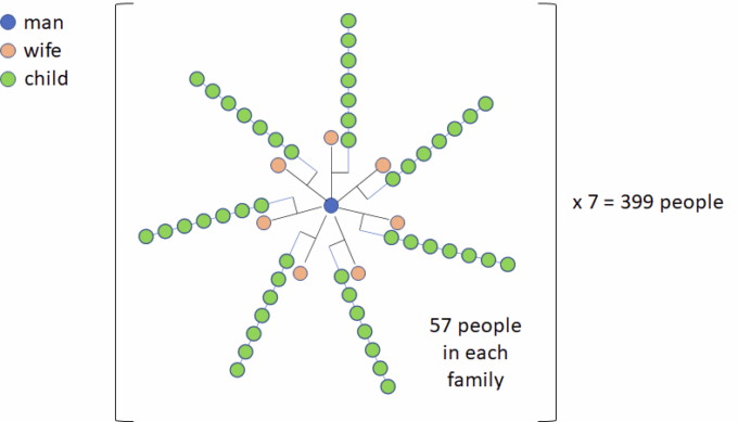 Почему загадка вызвала такие сложности? Из-за формулировки. Как понимать фразу «у 7 мужчин 7 жен»? Что у каждого мужчины по одной женщине или по 7 женщин сразу?