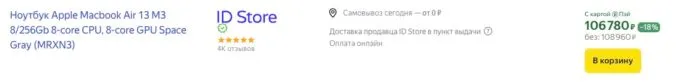 Главное — успеть, пока на Яндекс Маркете базовый MacBook Air с M3 отдают всего за 108 960 рублей. Также не забывайте, что многие банки предлагают щедрый кэшбек за покупки на этой платформе.