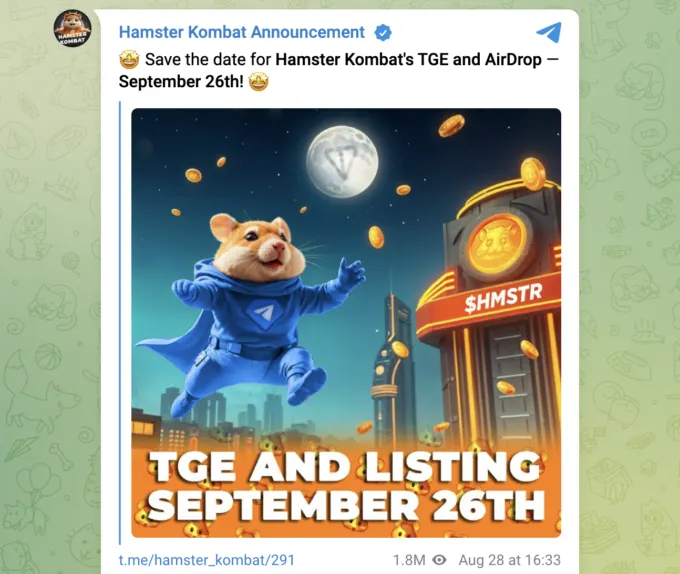 Информация появилась в официальном телеграм-канале проекта на 52 млн пользователей. Никаких подробностей — только анонс с датой и картинкой с изображением хомяка и токена HMSTR.