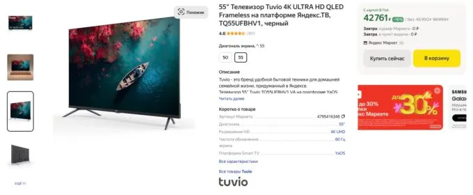 Обычно за Tuvio 4K ULTRA HD QLED на 55 дюймов просят больше 50 косарей, но сейчас на Яндекс Маркете флагманский телик можно урвать за 42 761 рубль. Также не забывайте, что многие банки готовы отсыпать щедрый кэшбек за покупки на этой платформе.