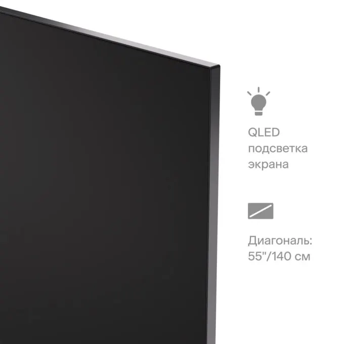 Наш девайс может похвастаться огромным 55-дюймовым QLED-дисплеем (VA-матрица) с разрешением 4K UHD (3840х2160 пикселей), стандартной частотой обновления 60 Гц, подсветкой на квантовых точках и поддержкой расширенного динамического диапазона HDR10. Вы точно будете в восторге от картинки при просмотре фильмов и сериалов. Цвета на таком экране будут намного сочнее, чем на обычных LED-теликах. К слову, у LG модели 2024 года с QLED-панелями стоят вдвое дороже этого лота — под 90 косарей.