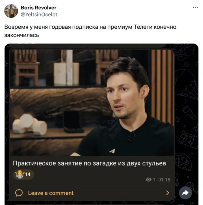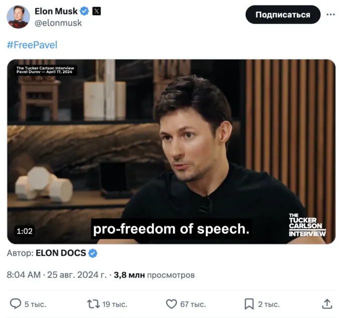 Босс SpaceX и Tesla Илон Маск опубликовал в твиттере хэштег #FreePavel и выложил фрагмент интервью Дурова американскому журналисту Такеру Карлсону. Карслон в свою очередь заявил, что Павла «заперла западная страна, союзник [президента США] Байдена и активный член НАТО».