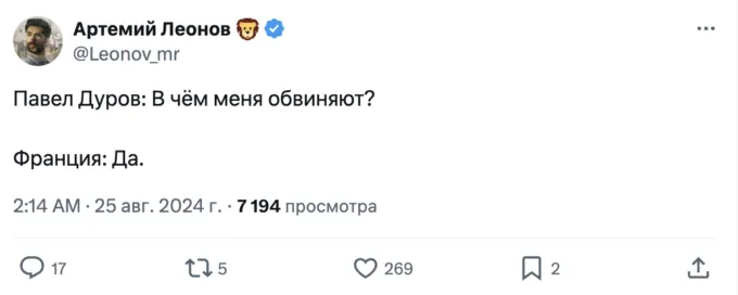 В ночь на 25 августа в Париже французской полицией был задержан основатель Telegram Павел Дуров. Создателя мессенджера обвиняют в ряде серьезных преступлений, за которые он может сесть на срок до 20 лет. В это время простые пользователи телеграма, блогеры, активисты, предприниматели и даже государственные деятели требуют освободить Дурова.