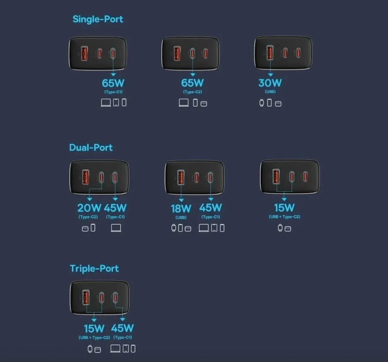 Я говорил, что GaN-зарядка имеет собственный чип. Он нужен в том числе для перераспределения нагрузки. Когда вы занимаете два порта или больше, процессор анализирует потребление энергии и выдает каждому гаджету столько, сколько нужно. Например, если подключить ноутбук и смартфон, то компьютер получит 45 Вт, телефон — 20 Вт. Если занять все три разъема, то главный потребитель (компьютер) будет заряжаться на мощности 45 Вт, а остальные получат суммарно 15 Вт. Вот табличка от производителя: