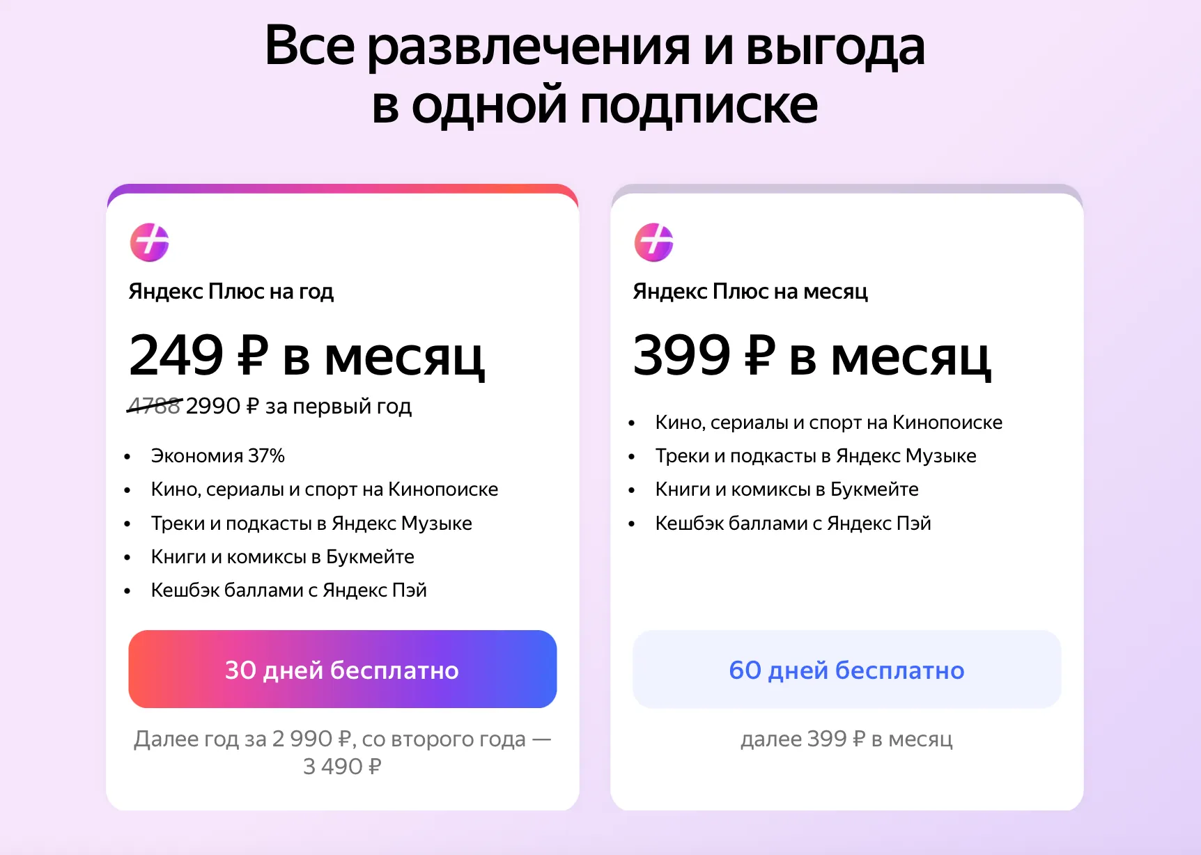 Как сэкономить на подписке? Лучше всего не оплачивать доступ каждый месяц, а покупать пакетом — на полгода, год или больший срок. Так, «Яндекс Плюс» на 12 месяцев обойдется в 2990 рублей — в пересчете на месяц подписка обойдется в 249 рублей.