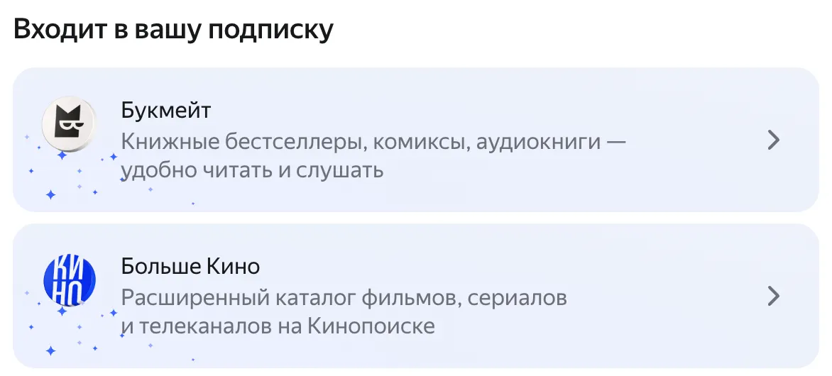 Теперь «Плюс» будет стоить 399 рублей в месяц, раньше — 299 рублей. В подписку войдут опция «Букмейт», которая дает доступ к одноименному сервису с электронной литературой и аудиокнигами, а также «Больше кино» для «Кинопоиска». Последняя фича добавит в ваш аккаунт фильмы и сериалы от viju и more.tv, пачку телеканалов Кино ТВ, viju TV1000 и Киномикс.