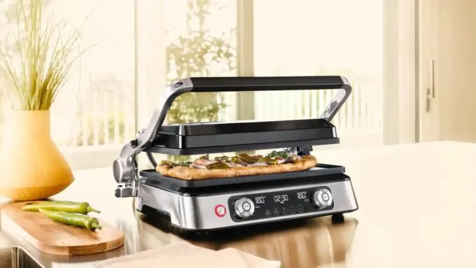 На передней панели Braun MultiGrill 9 Pro расположены две крутилки и несколько кнопок. С них можно выставить температурный режим (от 60° до 265°) или таймер. Ещё в этой модели предусмотрена система блокировки, чтобы девайс случайно не раскрылся.