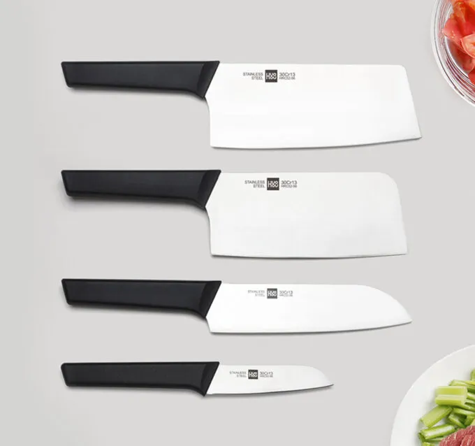 Что по ножам? В HuoHou Fire Kitchen Steel Knife Set все режущие девайсы выплавлены из нержавеющей стали 30Cr13. Xiaomi гарантирует защиту от коррозии и деформации. Также ножи можно смело дезинфицировать высокой температурой — они не начнут плавиться и не затупятся.