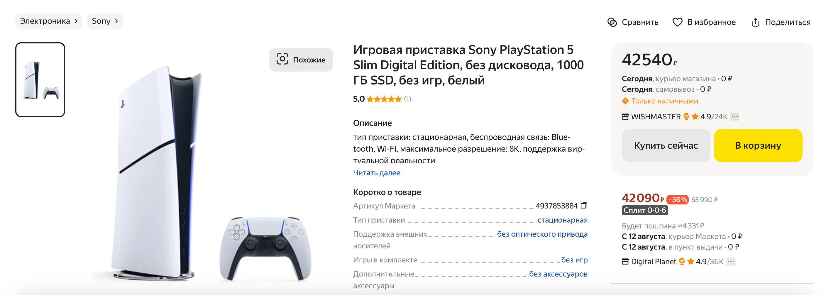 В последний летний месяц (для кого-то — последние отпускные недели) консоль PS5 без дисковода подешевела до 42,5 тысяч рублей. Покупать из-за рубежа (такая возможность есть на Маркете) не советуем: иностранные приставки стоят около 40К, но всю выгоду сожрет пошлина. А еще доставки придется ждать до двух недель.
