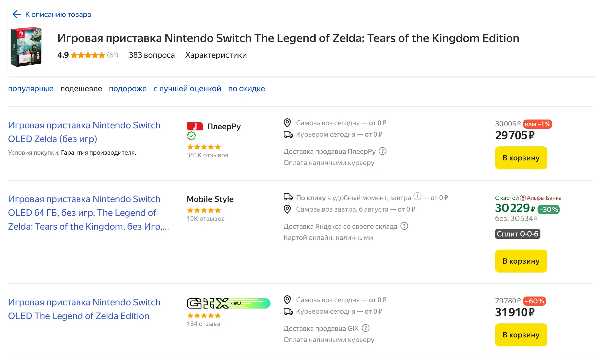 - Nintendo Switch OLED — 29 700 рублей, прошлый месяц — 31 400 рублей