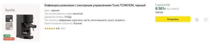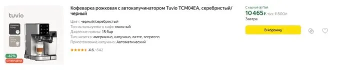 Намного проще и выгоднее купить кофеварку в дом. Тем более, сейчас Яндекс отдаёт пару крутых моделей Tuvio с капучинаторами по очень доступным ценам. Они вообще не уступают кофеваркам De’Longhi или Bosch, но стоят в разы дешевле.