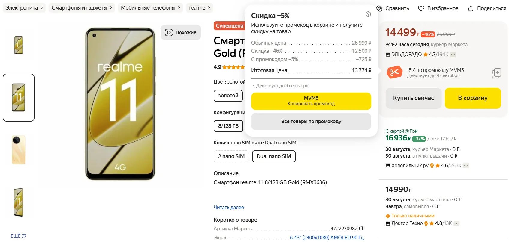 Как урвать смартфон по лучшей цене? Все просто: ныряйте на Маркет и добавляйте в корзину лот от «М.Видео» или «Эльдорадо», а на стадии оформления заказа введите промокод MVM5. В таком случае Realme 11 обойдется всего в 13 770 рублей — кайф! Кстати, подписчики нашего скидочного Телеграм-канала узнали об этой акции раньше всех — подписывайтесь, чтобы быть в курсе выгодных предложений со всего Интернета.