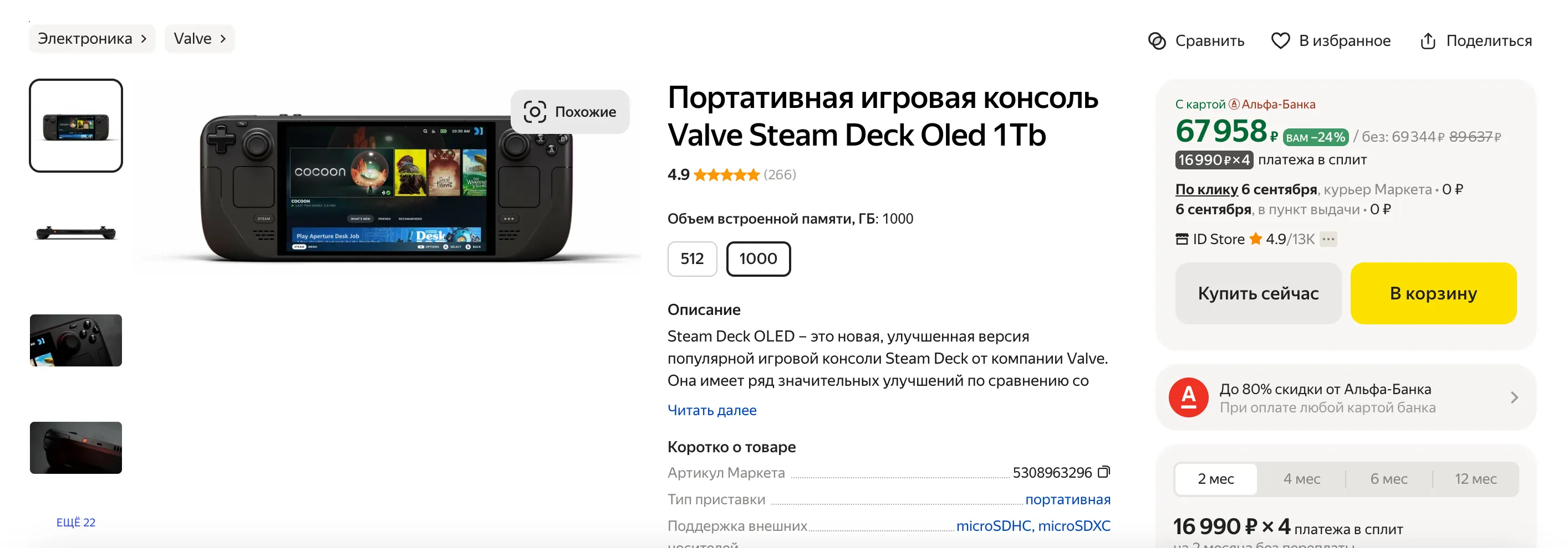- Valve Steam Deck OLED 1 Тбайт — 67 900 рублей, прошлый месяц — 70 300 рублей