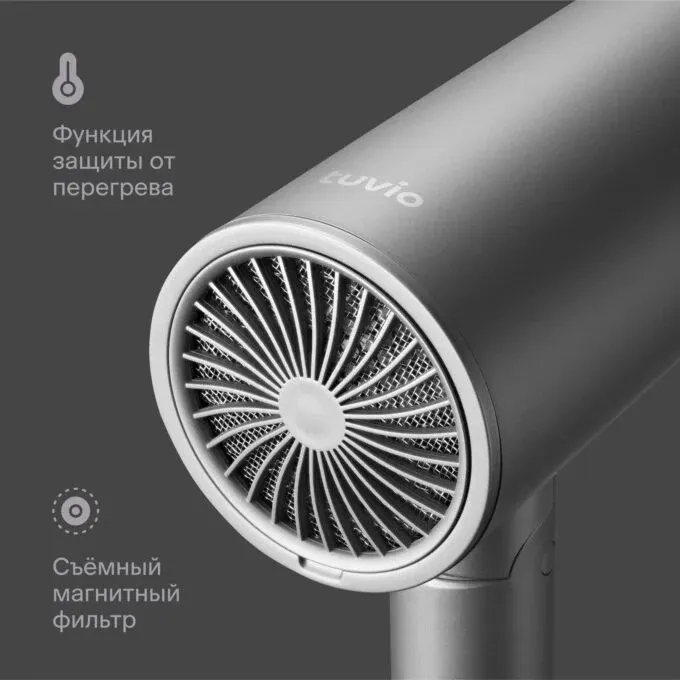 Tuvio HD20FI01 — минималистичный фен с нестандартной конструкцией и лаконичным дизайном. От большинства других фенов он отличается складной ручкой, что позволяет брать его с собой в путешествия. Странно, что сэр Джеймс Дайсон ещё до этого не додумался, и продолжает продавать один и тот же фен уже 8 лет подряд. В случае с нашим лотом мы записываем складную ручку в плюсы к практичности девайса. Отдельного респекта заслуживает нейтральная расцветка. Согласитесь, гаджет в тёмно-сером матовом корпусе смотрится намного солиднее ярких аналогов. Хотя бы не отдаёт лютой китайщиной.
