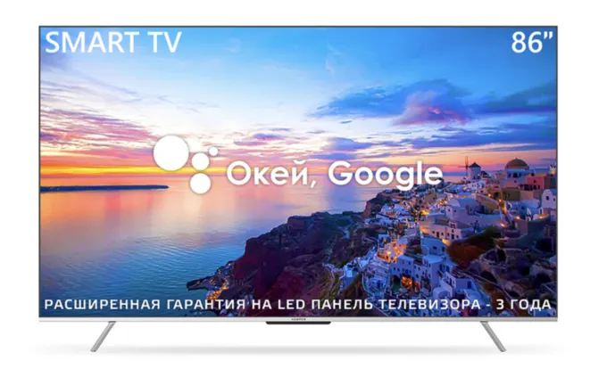 Самый доступный вариант в этой подборке. Телевизор имеет 86-дюймовую диагональ, разрешение 4К, обычную VA-матрицу с неплохой цветопередачей, платформу Android TV. 2 Гбайт ОЗУ должно вполне хватить, чтобы комфортно пользоваться Smart TV. Разумеется, есть USB 2.0 и HDM, а для более быстрого подключения интернета присутствует поддержка Wi-Fi 5 ГГц.