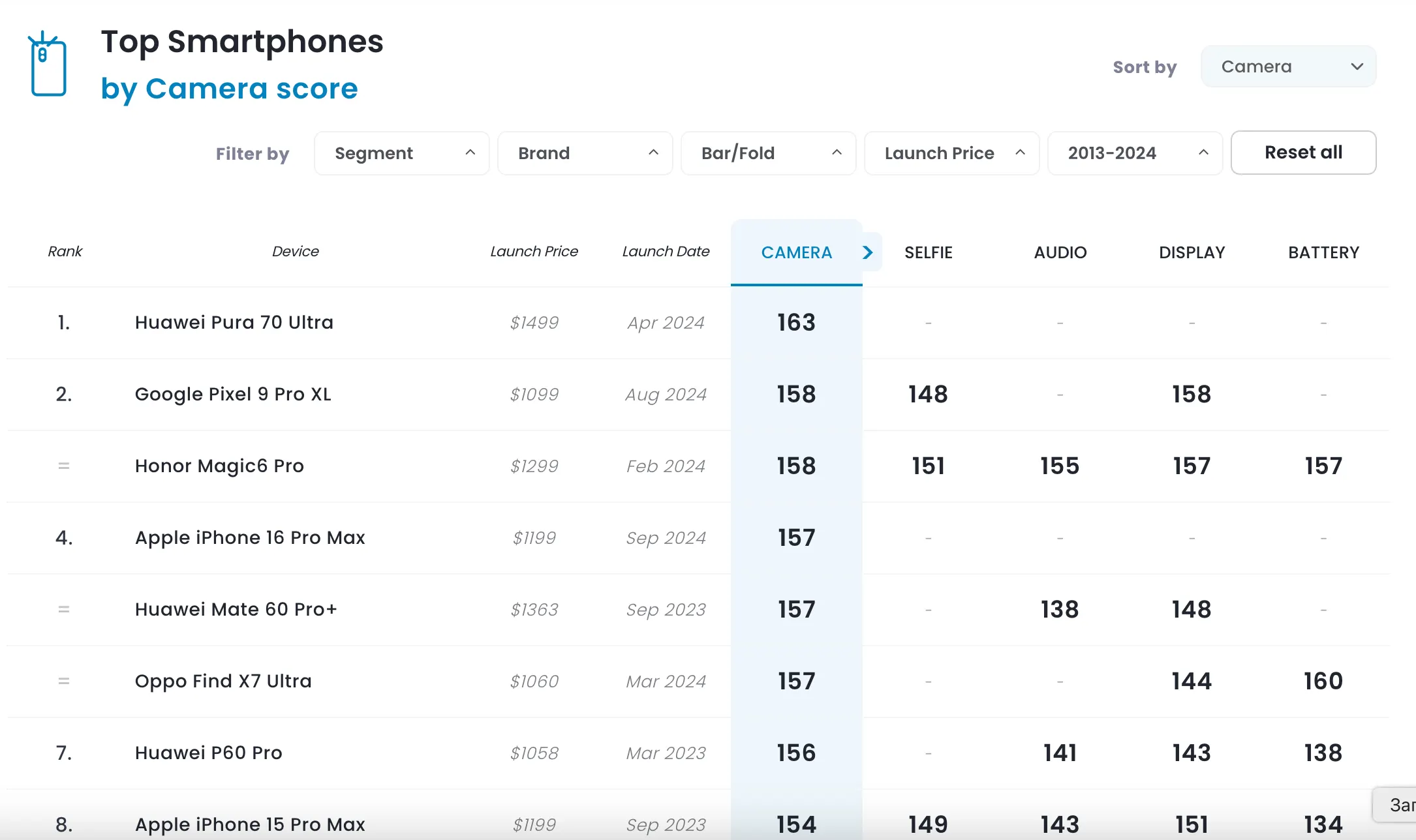 Все хорошо, но в рейтинге камерофонов 16 Pro Max получил лишь 4-е место. Выше оказались Google Pixel 9 Pro XL и Honor Magic 6 Pro (оба — по 158 баллов), лидером DxOMark остался Huawei Pura 70 Ultra (163 балла).