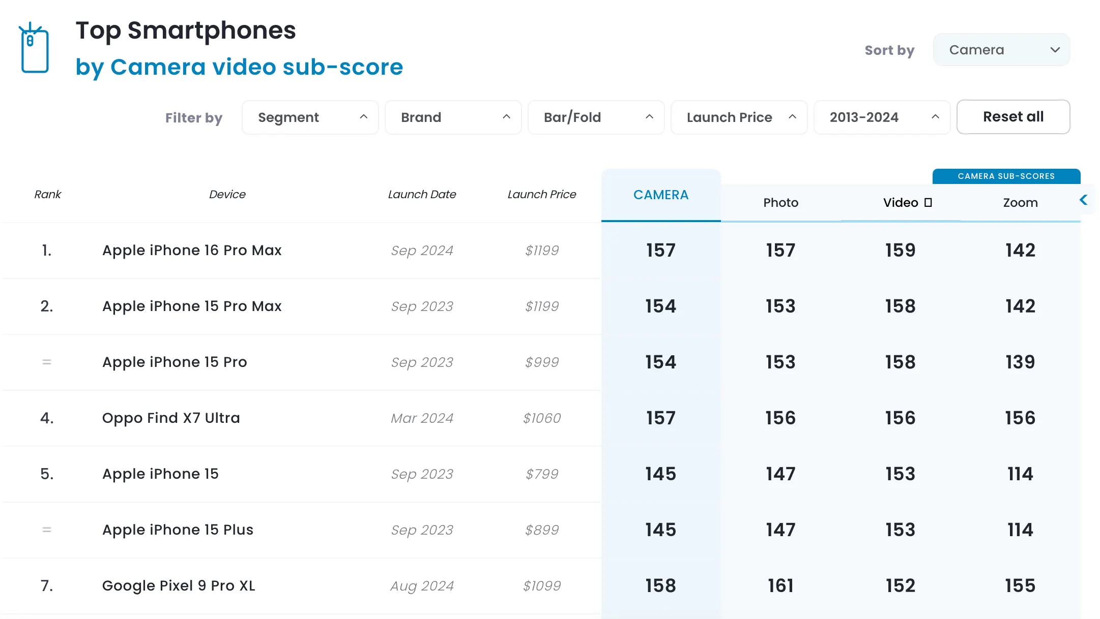 Зато в топе смартфонов, оцениваемых по качестве видеосъемки, лучше iPhone 16 Pro Max нет. В топ-3 — полное превосходство Apple.