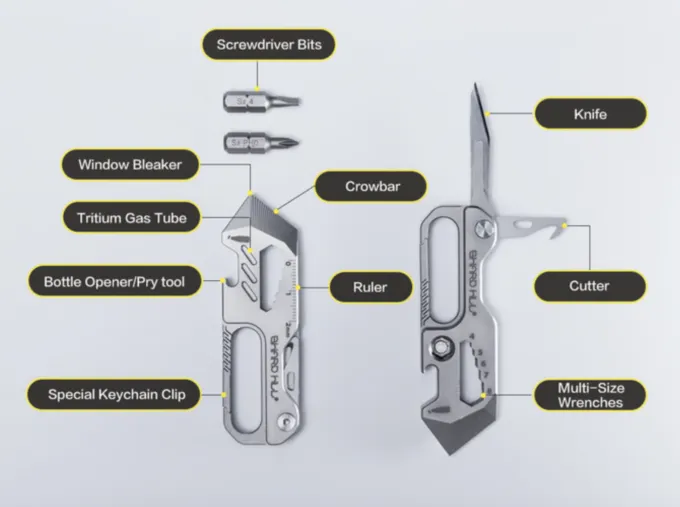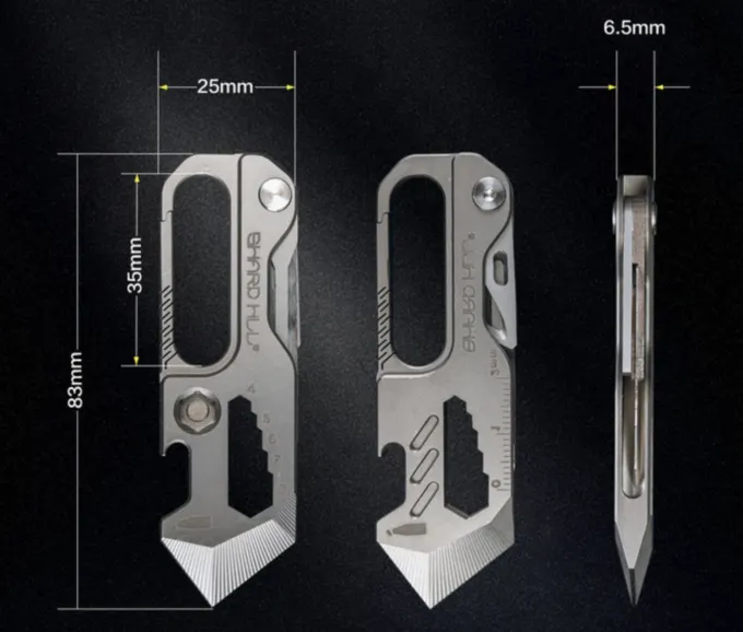 Sharp Hill получил корпус из титана, на котором грамотно расположили 11 инструментов. Длина устройства составляет 8,3 см, а ширина — всего 0,6 см. Вес — лишь 75 граммов. То есть его можно как таскать в рюкзаке, так и повесить на ключи или кинуть в карман.