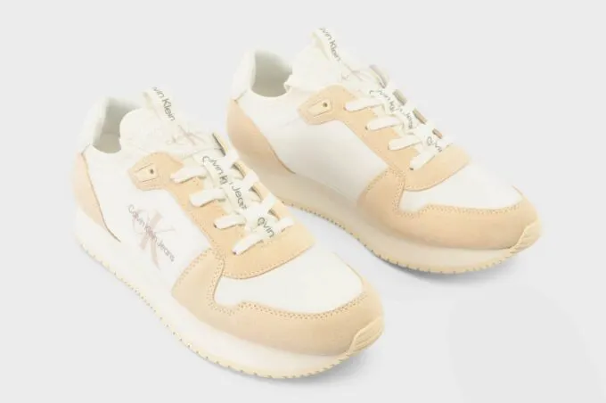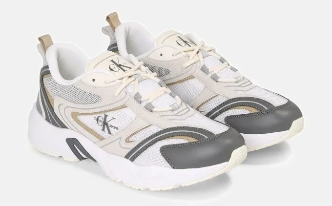 Первый айтем – серо-белые Retro Tennis Su-Mesh. Название намекает, что эта обувь вдохновлена дизайном ретро-кроссовок. Верх выполнен из натуральной кожи и синтетического материала, а язычок и боковые части украшены логотипами Calvin Klein. Хороший и небанальный вариант на лето и раннюю осень.