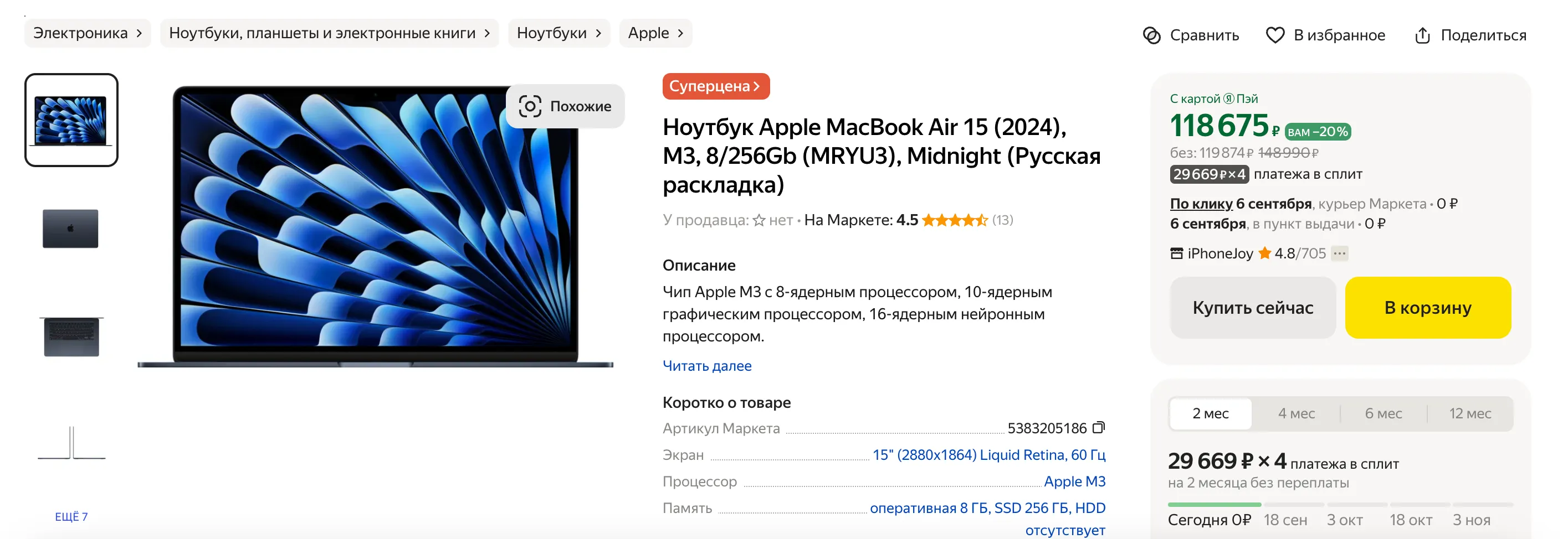 - MacBook Air 15 M2 (8/256 Гбайт) — 118 000 рублей. Прошлый месяц — 118 800 рублей