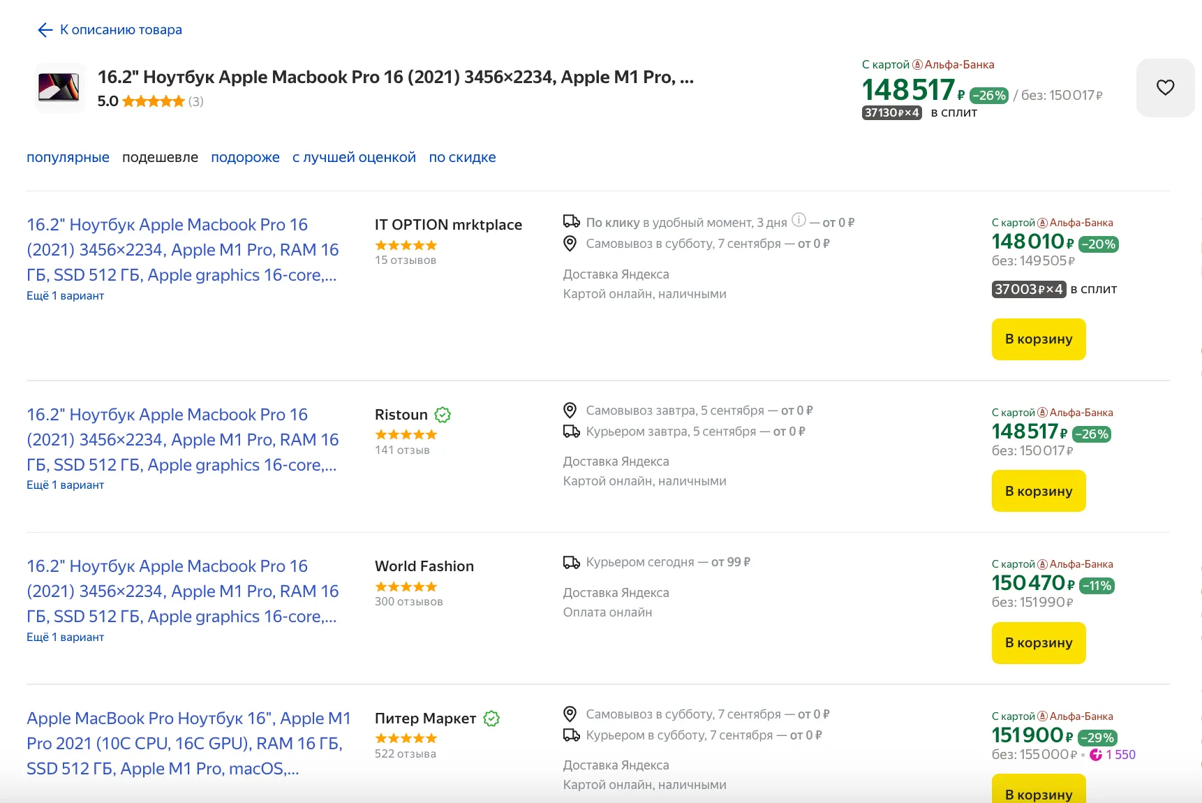 Обратите внимание, как подешевели «прошки». Выделим 16-дюймовую модель на чипе M1 Pro, проверенный и мощный вариант — ультрабук с 16 Гбайт ОЗУ стоит почти на 50 тысяч рублей дешевле, чем в августе!