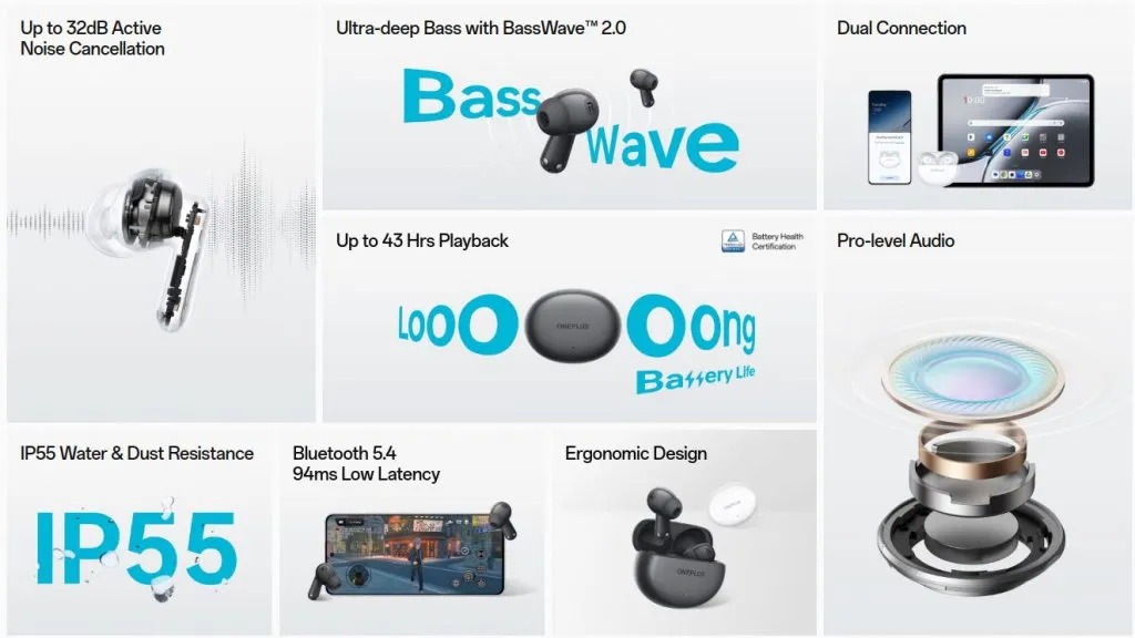 Гарнитура вышла с 12,4-мм драйверами, есть «улучшайзер» BassWave 2.0, который прокачивает бас. Также гаджет работает с энергоэффективным протоколом Bluetooth 5.4 и может быстро подключаться к Android-смартфонам через технологию Google Fast Pair.