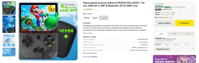 Обычно за Anbernic RG35XX Plus (2024) просят под 15 косарей, но сейчас на Яндекс Маркете топовую консоль для ретро-эмуляции можно забрать за 6999 рублей – и будет быстрая доставка. Также не забывайте, что некоторые банки готовы отсыпать кэшбек за покупки на этой площадке.