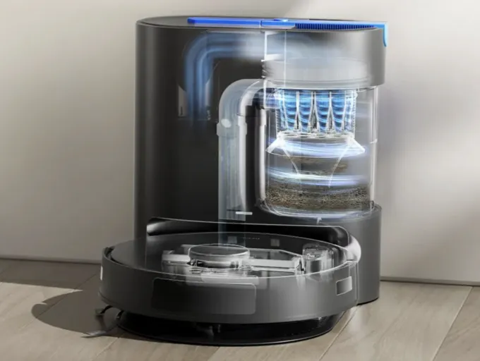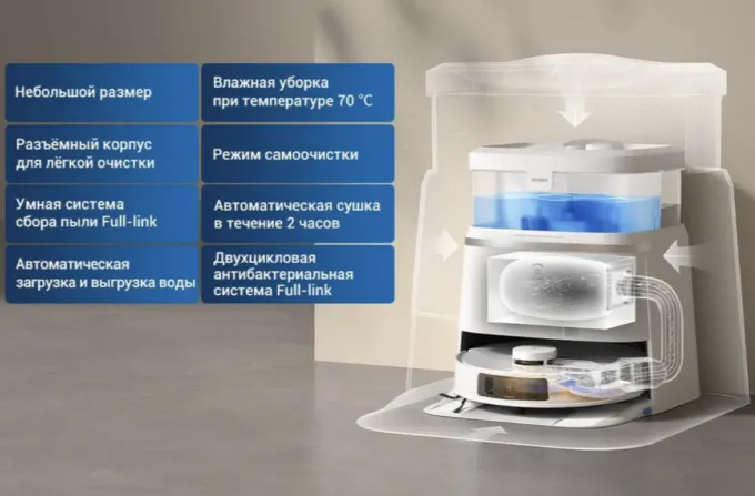 Флагман имеет две круглые насадки с салфетками, которые умеют подниматься на высоту 9 мм. Пылесос выдвигает салфетки при проезде рядом со стеной или мебелью, чтобы не оставить слепых зон. Кстати, влажная уборка проходит при температуре воды 70 градусов. Наконец, тут самая продвинутая станция самоочистки, которая собирает пыль и меняет грязную воду в контейнере на чистую. Автоматическая система регулирует количество промывок салфеток в зависимости от загрязнения, а еще после каждого цикла два часа сушит салфетки теплым воздухом. Самый сложный по конструкции пылесос бренда легко управляется через приложение, а еще запустить уборку можно просто коснувшись девайса ногой.
