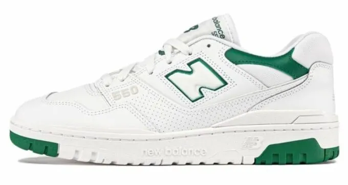 Теперь взгляните на бело-зеленые New Balance 550, отсылающие нас к винтажным кроссовкам из восьмидесятых. Обувь выполнена из искусственной кожи, а за удобство отвечают мягкая вставка в зоне щиколотки и текстильная подкладка.