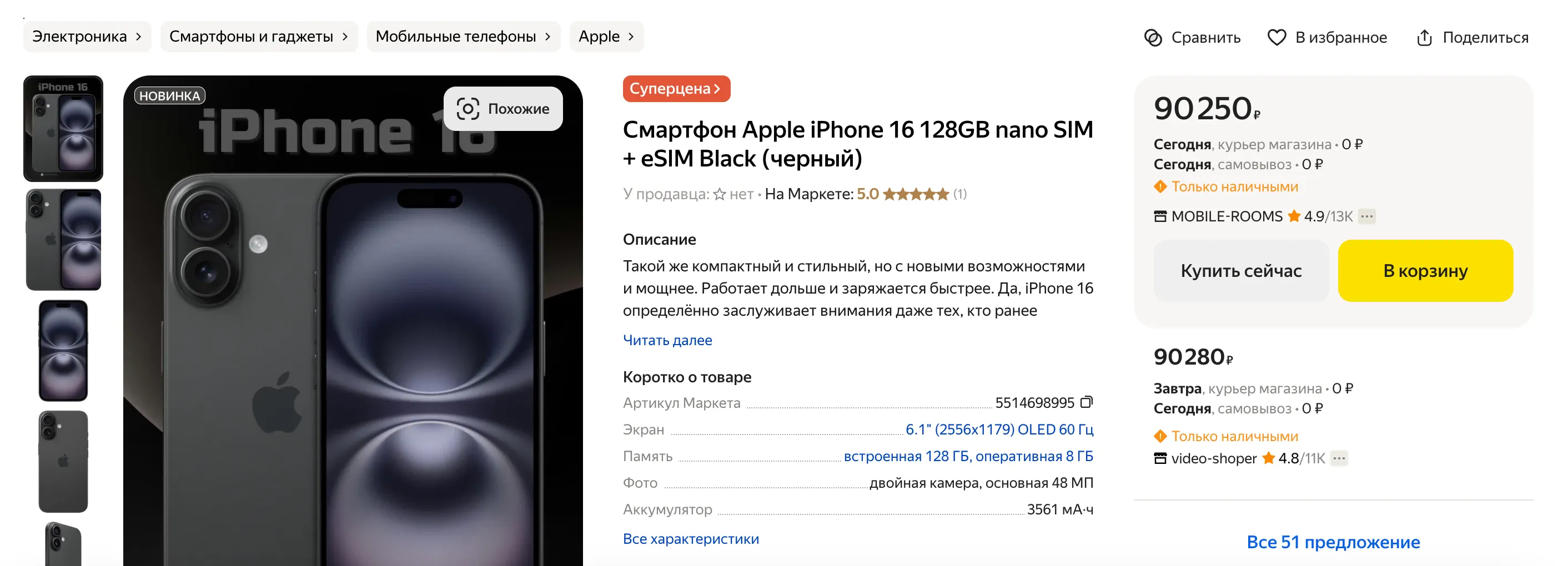 • Но есть первые скидки. Так, стартовый iPhone 16 уже можно купить меньше чем за 100 тысяч рублей. У некоторых продавцов он стоит около 90 тысяч рублей.