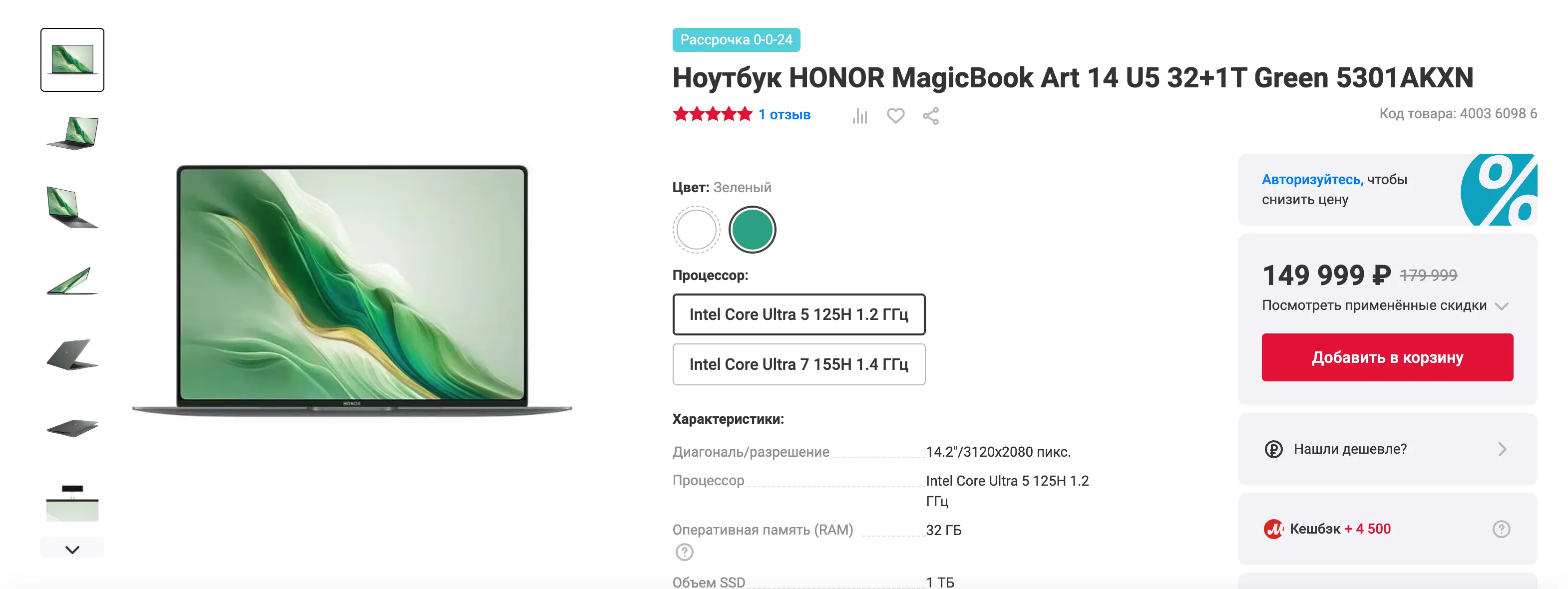 Honor MagicBook Art 14 с чипом Intel Core Ultra 5 обойдется в «М.Видео» в 150 тысяч рублей, версия с процессором Intel Core Ultra 7 стоит 170 тысяч рублей. Эти цены актуальны при покупке с 15 октября по 17 ноября — потом они вырастут на 30 000 рублей. За предзаказ модели дарили планшет, но акция закончилась 14 октября.