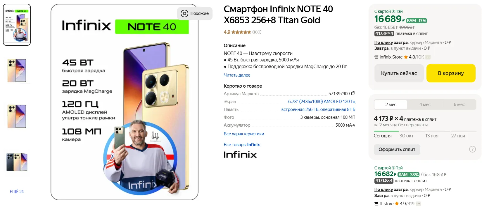 На Маркете за смарт просят меньше 17 кэсов, причем прайс персональный и зависит от аккаунта: например, в нашем «сыром» профиле Infinix Note 40 доступен за 16 690 рублей, а на вашем старом акке цена, возможно, ниже на пару штук. Обязательно проверяйте!