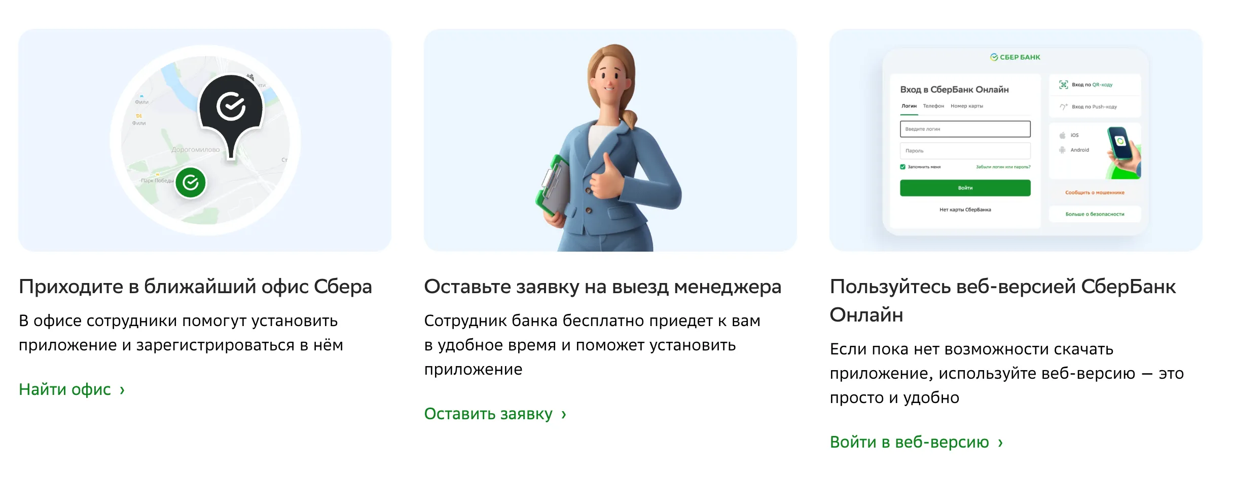 Если актуальной версии клиента «Сбербанк Онлайн» нет, то банк предлагает прийти в ближайший офис и установить его. Или вызвать специалиста Сбера домой. На крайний случай можно воспользоваться веб-версией «СБОЛ».