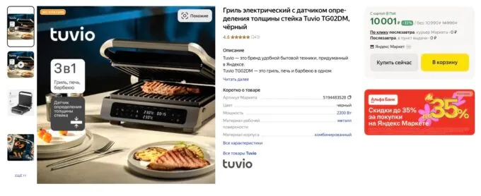 Прямо сейчас на Яндекс Маркете хитовый электрогриль Tuvio TG02DM можно купить с 33%-скидкой всего за 10 001 рубль. А с кэшбеками некоторых банков он обойдётся ещё дешевле.
