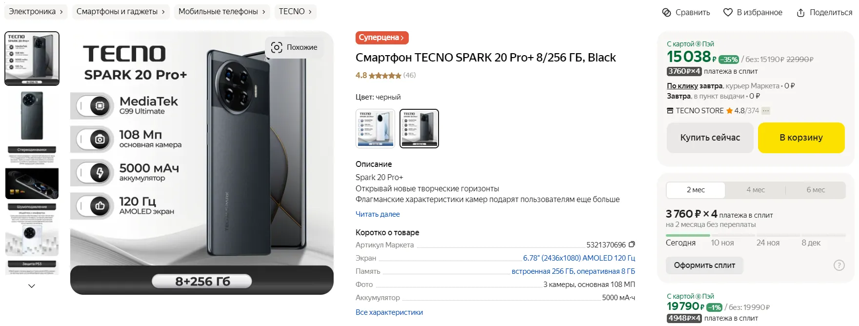 В 2024 году часто рекомендовали Tecno Spark 20 Pro+, потому что это стильный бюджетник с неплохими характеристиками. Обычно за смартфон просили 17-20 тысяч, но мы заметили, что девайс резко подешевел на Маркете — все из-за того, что в России уже началось продвижение 30-ой серии «спарков».